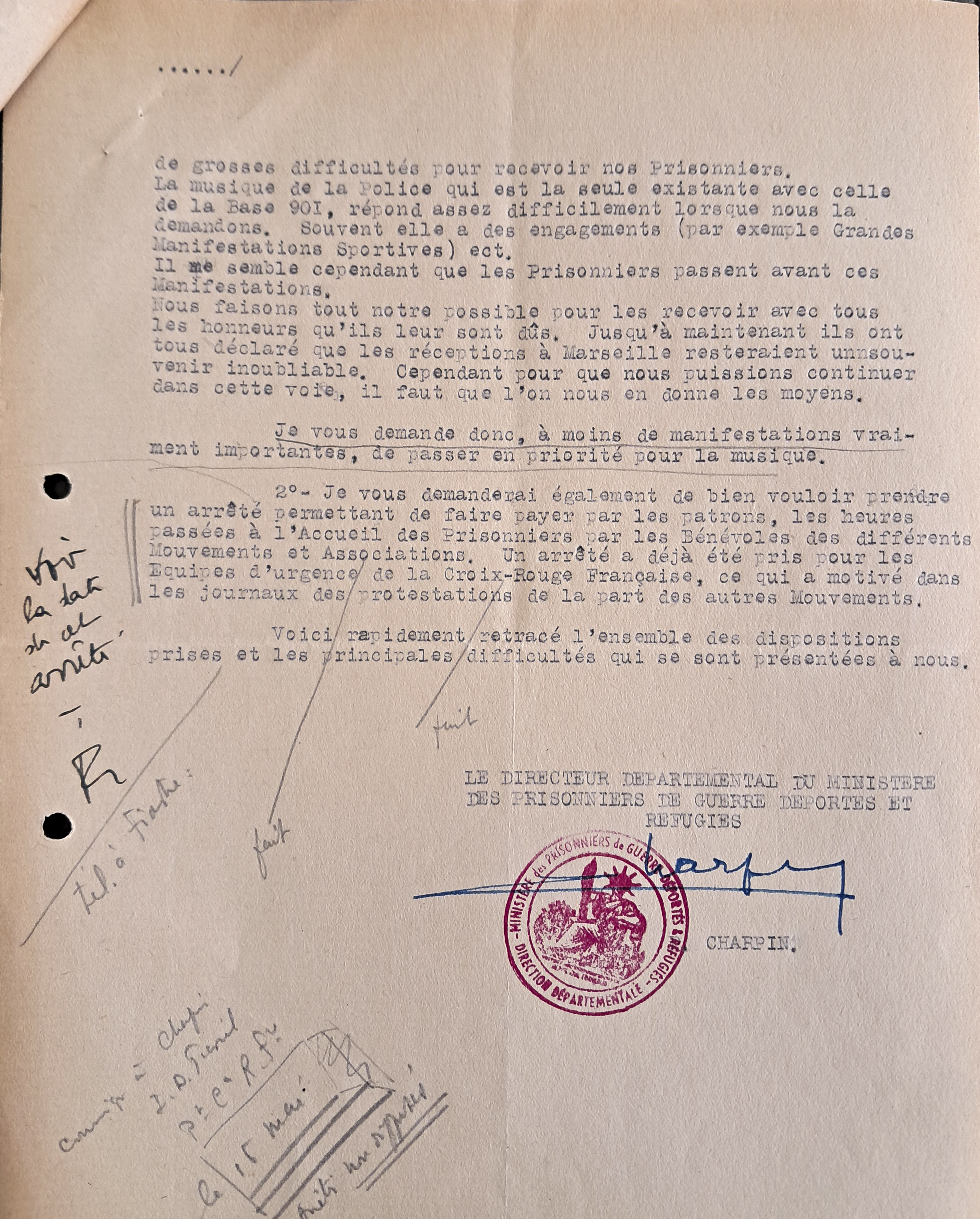 – il est à craindre que l'accueil des prisonniers (on remarque que les déportés ne sont mentionnés qu'en début de document en reprise d'une formulation officielle) ne puisse toujours se faire en musique. La musique de la police et de la base militaire ne sont pas toujours disponibles.