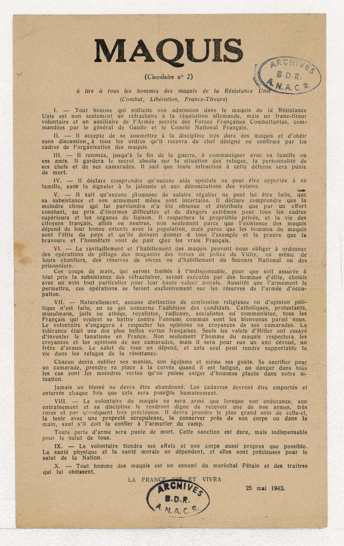 Circulaire envoyée par les Mouvements Unis de Résistance (MUR) aux membres des maquis afin que tous soient conscients des conditions matérielles et morales de leur engagement, 25 mai 1943.