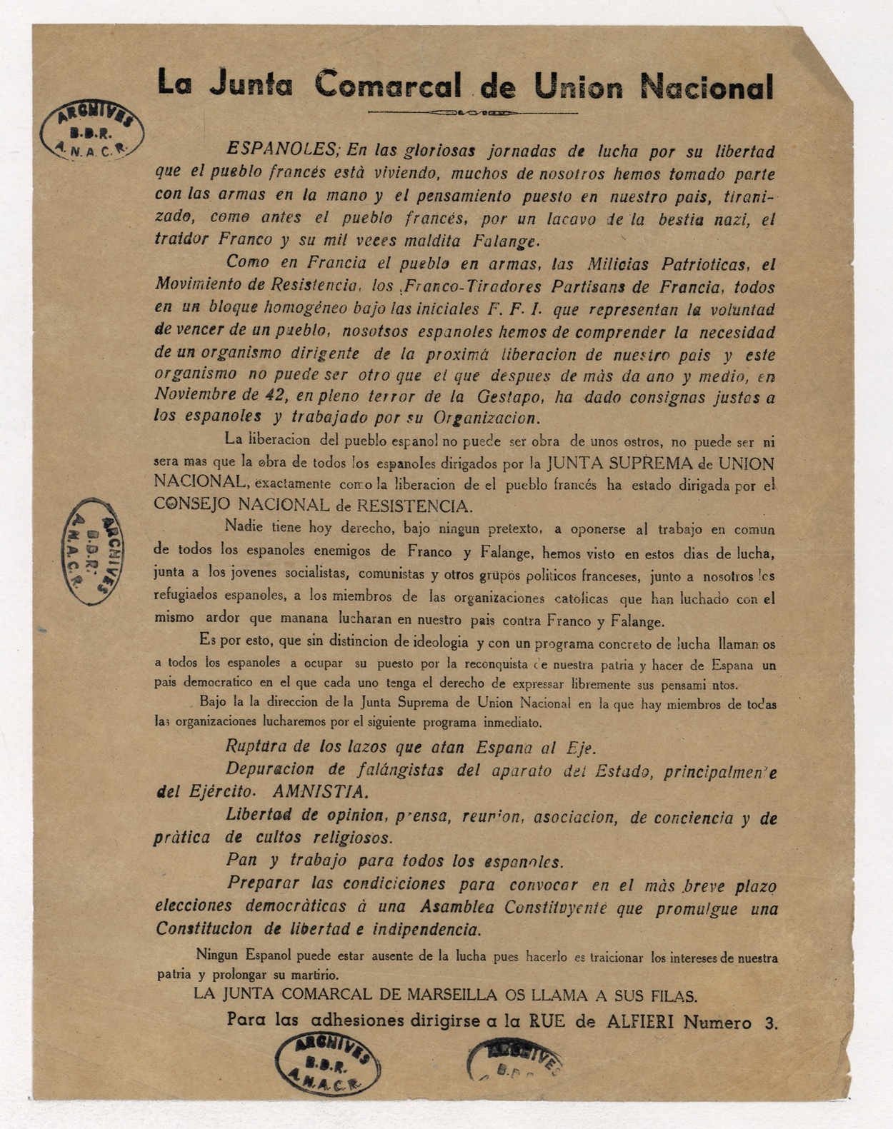 Ce document est un tract émanant des représentants à Marseille de l'Union Nationale Espagnole (UNE) créée par le parti communiste espagnol(voir contexte historique). La typographie permet de voir qu'il a été tapé sur une machine française. Sa provenance, archives de l'ANACR, ainsi que la syntaxe, permettent d'émettre l'hypothèse que ce sont des militants non hispanophones, qui ont réalisé l'impression du document. Le document est postérieur à la libération de Marseille(29 août 1944) puisqu'une adresse est indiquée en fin de document : 3 rue Alfieri (actuelle rue Fernand Pauriol dans le 5e arrondissement de Marseille). Il est destiné à préparer la « reconquête » de l'Espagne qui se concrétisera par la désastreuse expédition du Val d'Aran (19-29 octobre 1944)