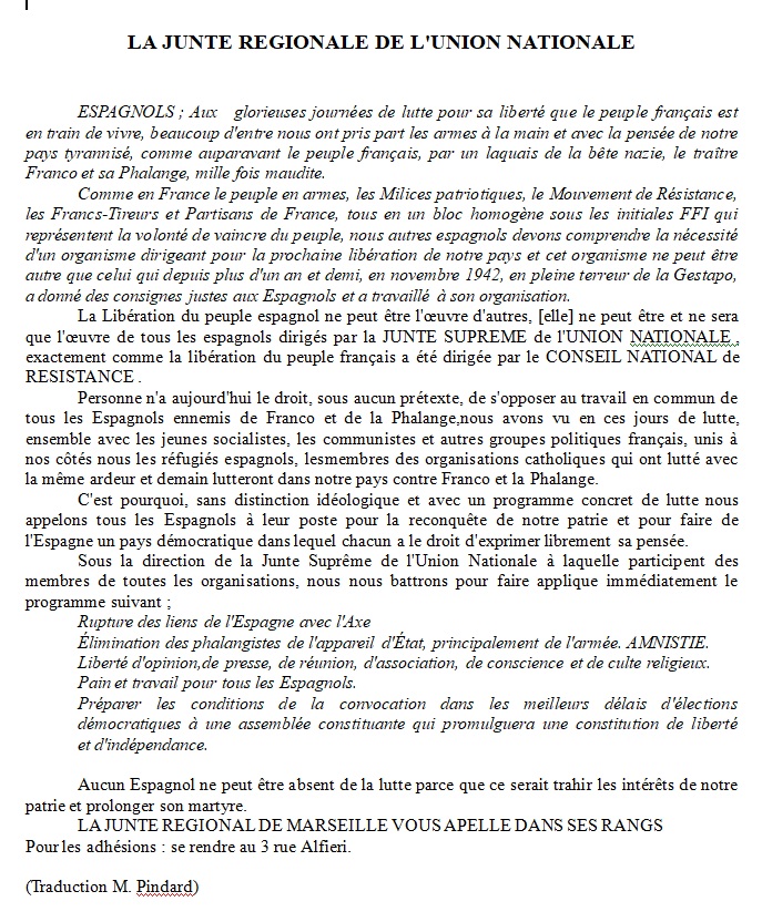 Ce document est un tract émanant des représentants à Marseille de l'Union Nationale Espagnole (UNE) créée par le parti communiste espagnol(voir contexte historique). La typographie permet de voir qu'il a été tapé sur une machine française. Sa provenance, archives de l'ANACR, ainsi que la syntaxe, permettent d'émettre l'hypothèse que ce sont des militants non hispanophones, qui ont réalisé l'impression du document. Le document est postérieur à la libération de Marseille(29 août 1944) puisqu'une adresse est indiquée en fin de document : 3 rue Alfieri (actuelle rue Fernand Pauriol dans le 5e arrondissement de Marseille). Il est destiné à préparer la « reconquête » de l'Espagne qui se concrétisera par la désastreuse expédition du Val d'Aran (19-29 octobre 1944)