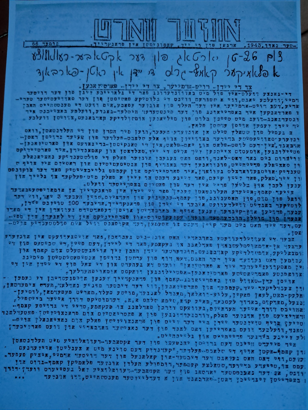 Numéro 66 d'UnzerWort, journal de la section yiddishophone de la MOI (Main-d'oeuvre immigrée), 1 novembre 1943