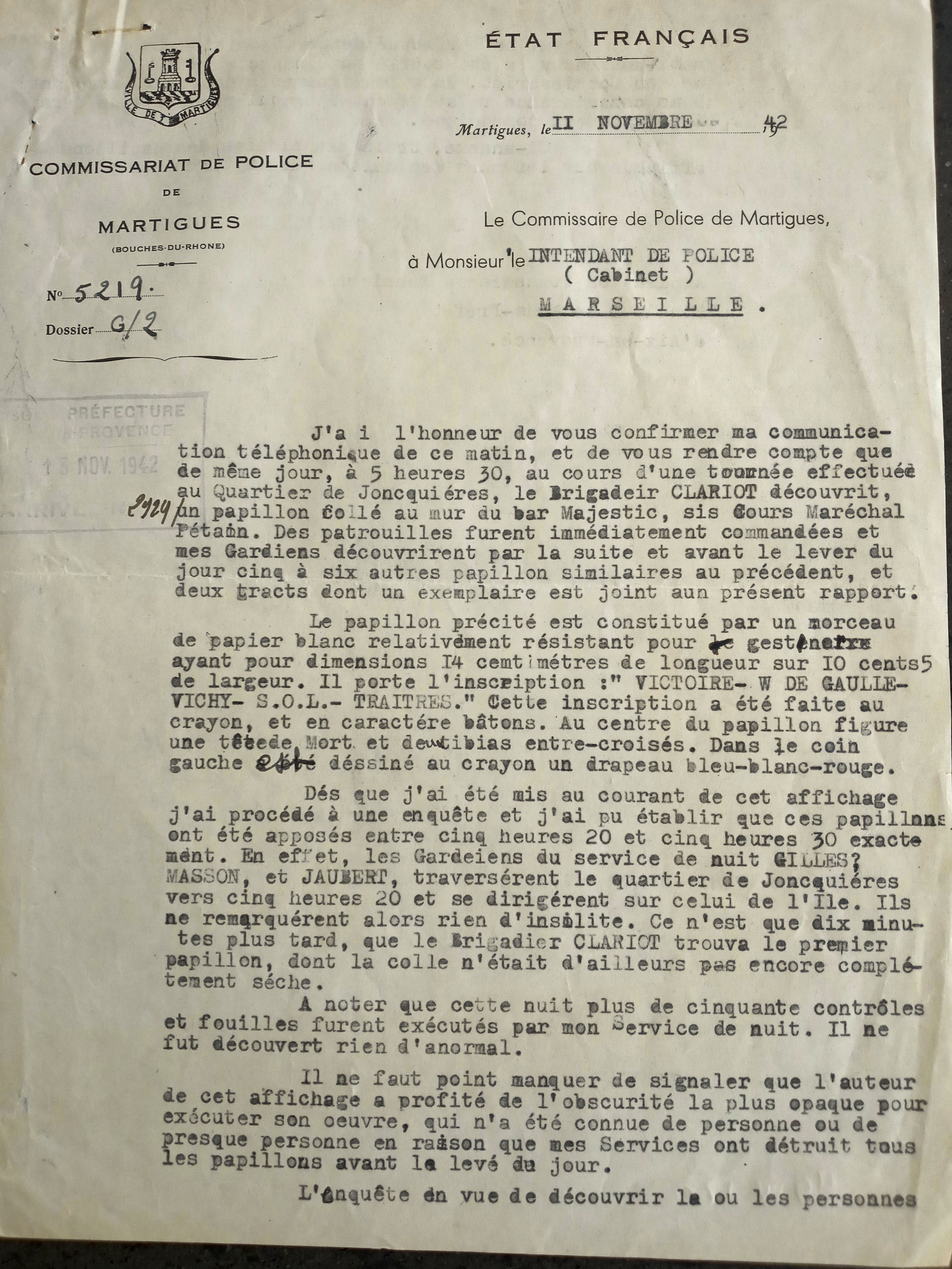 Le 11 novembre 1942, les policiers de Martigues découvrent, en faisant des rondes, que des papillons ont été collés au petit matin cours du maréchal Pétain. Le commissaire de Martigues joint des exemplaires saisis au rapport qu'il envoie immédiatement à l'intendant de police du département (voir album). Les exemplaires transmis montrent que plusieurs personnes ont confectionné à la main les papillons. Ils ne demandent pas un grand matériel : des étiquettes faciles à trouver dans le commerce, un tampon pour l'un, du papier et des crayons de couleur pour l'autre. Les deux sont de dimensions modestes.  Curieusement le premier papillon « Prolétaires unissez-vous » (visuel a) ne donne pas lieu à un commentaire.