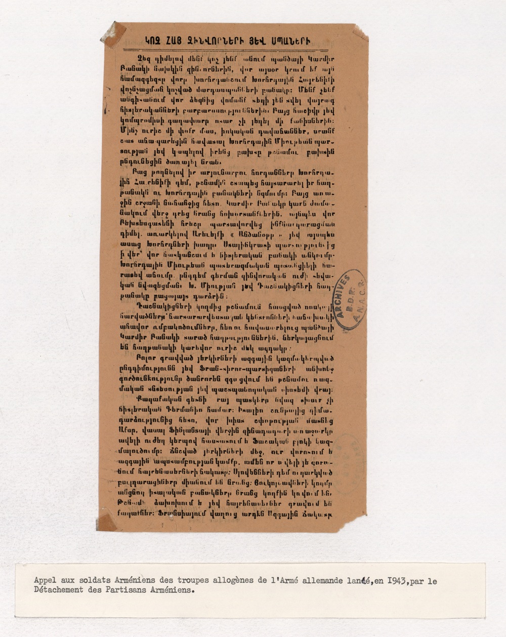Tract de la section arménienne de la MOI aux soldats arméniens de l'Ostlegion, février 1944.