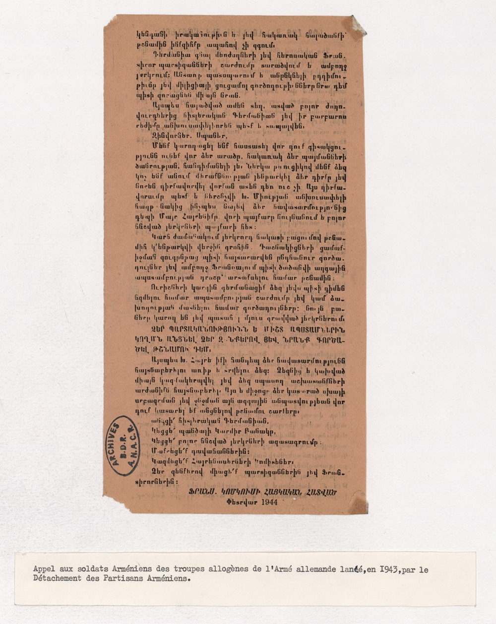 Tract de la section arménienne de la MOI aux soldats arméniens de l'Ostlegion, février 1944.