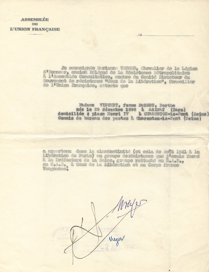 Berthe, Céline VINCENT née le 29 décembre 1896 à Arifat dans le Tarn est décédée le 28 janvier 1990 à Santeny.