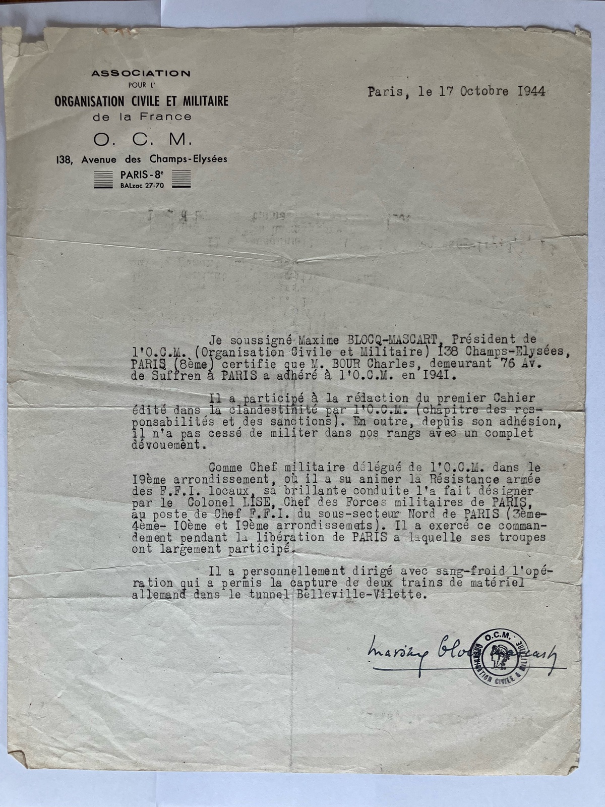 Membre de l’Organisation Civile et Militaire (OCM)dès 1941, il a participé à la rédaction du premier cahier de l’OCM, rédigé dans la clandestinité (Chapitre des Responsabilités et des sanctions).