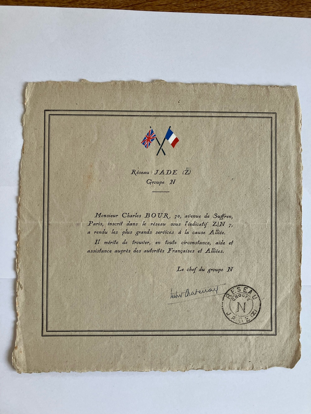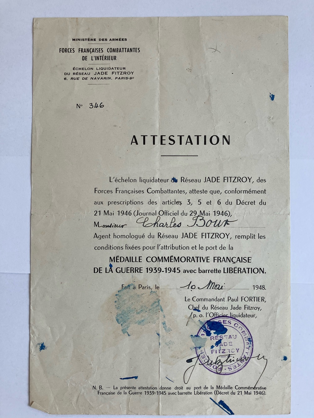 Il a fait partie des réseaux de résistance JADE Fitzroy et BRUTUS.