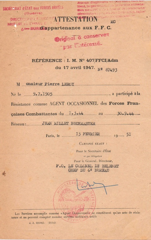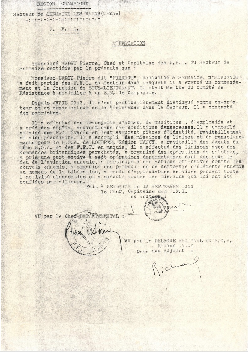 Dès sa démobilisation et son retour à Sermaize en août 1940 il cherche les moyens de servir son pays. Après quelques actions individuelles (recherche et récupération d’armes et de munitions), il participe à la création et l’organisation de la Résistance dans le Secteur. En septembre 1944, le Chef capitaine des FFI du Secteur atteste officiellement : « Pierre Leroy, dit « Pierrot », a effectué des transports d’armes, de munitions, d’explosifs et créé des dépôts dans des conditions souvent dangereuses. Il a camouflé et aidé des Prisonniers de Guerre évadés en leur assurant pièces d’identité, ravitaillement et aide pécuniaire. Il a accompli des missions de liaison et de