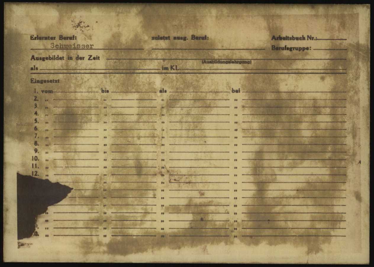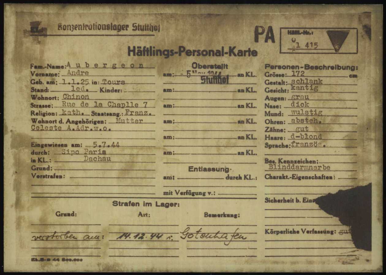 Lieux : Dachau (matricule 77541) le 05/07/1944, KL Stutthof (matricule 101415), transféré au Kommando Gotenhafen