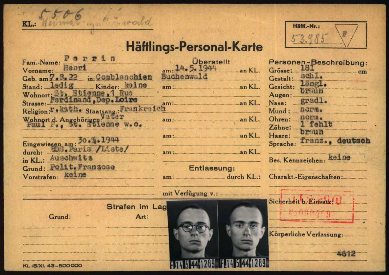 Lieux : Auschwitz le 30/04/1944 (matricule 186206), Buchenwald le 14 mai 1944 (matricule 53985)