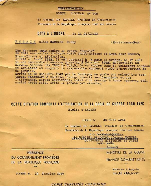 Le 20 juin, celui-ci entre au directoire des MUR. De plus, il a pris la direction départementale de Résistance-Fer. Henri Perrin tombe entre les mains du SD le 13 novembre 1943 sur "lecture" des fiches de la police française. Il est déporté à Buchenwald. Il en reviendra à la libération des camps de la mort. Duroux a pris sa suite à Franc-Tireur. Calamand vient tout juste d'entrer en action dans la Loire. La guerre finie, lui qui fut jadis novateur, penseur et acteur dans la Résistance, va disparaître, noyé dans la masse du commun. Il se fait oublier dans la vie courante sans autre prétention. Contacté à plusieurs reprises par des amis personnels, il ne donne aucune nouvelle. Henri Perrin s'accomplit tel qu'il a toujours été, avec sa modestie naturelle. Il aurait pu faire de sa sortie de l'ombre un piédestal, un flambeau. Il ne l'a pas voulu. Il y a une dominante dans sa vie : servir, servir la Nation.